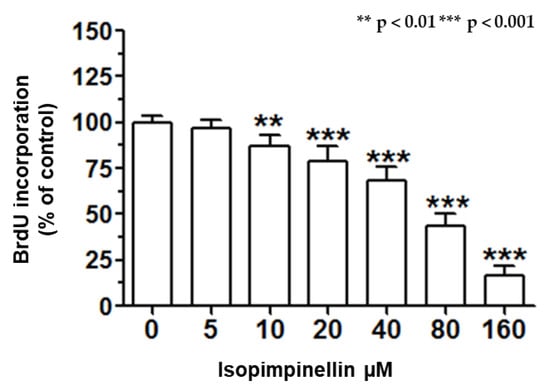 Since isopimpinellin showed the greatest growth inhibitory potential and selectivity against the Saos-2 line, these cells were selected for the further study to explore the anticancer mechanism of its action. The anti-proliferative effect of IsoP against the Saos-2 cells was a consequence of impaired cell division, as indicated by the BrdU proliferation assay. As shown in Figure 9, the 72-hour incubation with IsoP in a dose-dependent manner reduced the number of cells undergoing DNA replication. The lowest concentration at which IsoP significantly suppressed DNA synthesis was 10 µM. After the treatment with its maximal concentration (160 µM), the mitotic activity of the cells was reduced by 84%.