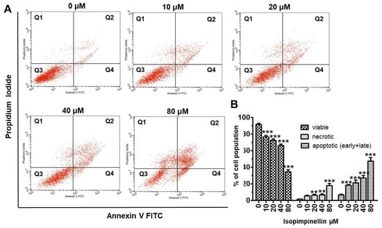 To test whether the cytotoxicity of IsoP could also result from the induction of cell death, the Saos-2 cells were treated with different IsoP concentrations for 72 h, and then necrotic and apoptotic cells (early and late) were measured cytometrically. IsoP at concentrations up to 40 µM resulted in only a slight (up to 4–5%) increase in necrotic cells compared to the control. However, a substantial increase in necrosis (up to 18%) was elicited by the dose of 80 µM. In contrast to necrosis, the level of apoptosis increased gradually with the increasing IsoP concentration (Figure 10A). The percentage of cells undergoing apoptosis increased from 5.52 in the control to 21.38%, 27.12%, and 47.46% at 20, 40, or 80 µM, respectively (Figure 10B).