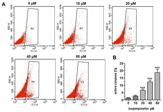 The proapoptotic potential of IsoP was further determined by measuring active caspase-3. Caspase-3 is an executive cysteine aspartate specific proteinase activated by both the intrinsic and extrinsic death pathways in apoptosis. The activated enzyme cleaves intracellular structural proteins and functional proteins and leads to cell destruction through the mechanism of apoptosis [38]. As shown in Figure 11A,B, IsoP caused a rise in the number of osteosarcoma cells with active caspase-3 in a concentration-dependent manner. Compared to the control culture (1.43%), the amount of caspase-3 positive cells at 10 µM, 20 µM, 40 µM, and 100 µM IsoP concentrations was 2.70%, 6.71%, 12.42%, and 18.68%, respectively. The flow cytometry data clearly indicate that IsoP-mediated apoptosis is a caspase-dependent process involved in the cytotoxic effects of the tested compound.