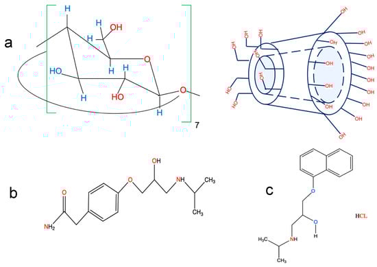 Chemical structures of (a) β-CD, (b) atenolol (ATE), and (c) propranolol (PRO).