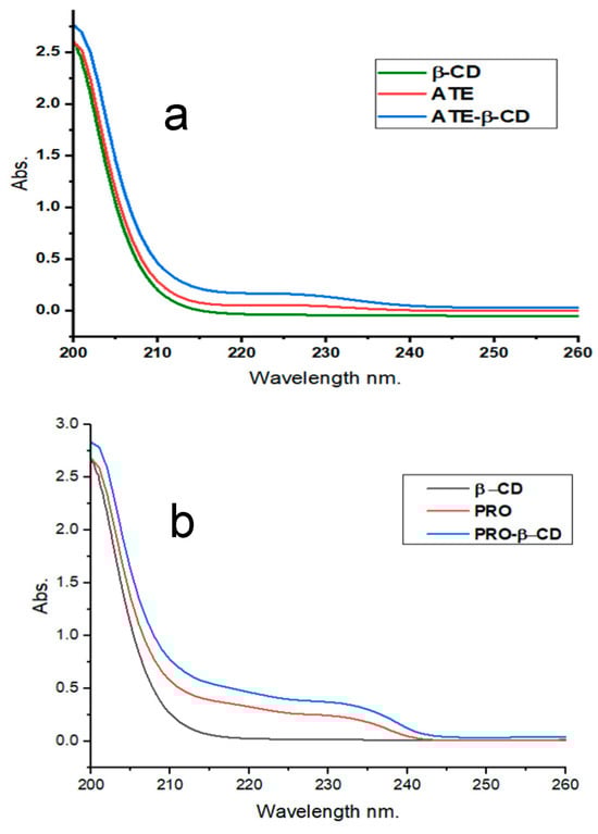 Absorbance spectra for (a) ATE-β-CD, 10 μM ATE, 6 × 103 μM β-CD, for time 10 min, at room temperature, pH 7.0; and (b) 10 μM PRO, 6 × 103 μM β-CD, for time 10 min, at room temperature, pH 7.0.