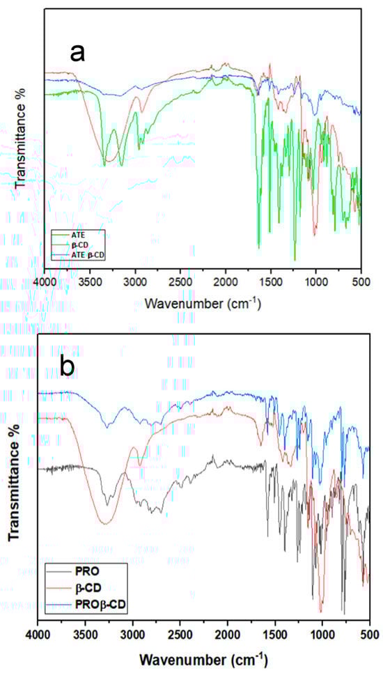 FTIR spectra of (a) ATE, β-CD, and ATE-β-CD (b) PRO, β-CD, and PRO-β-CD.
