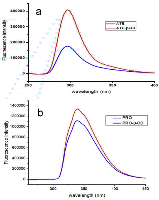 Fluorescence spectroscopy is a highly sensitive and selective tool for studying host–guest molecular systems. Fluorescence analysis has significant advantages in terms of its enhanced selectivity and ability to quantify much lower concentrations when compared to spectrophotometric analysis. Initially, analysis was conducted on the spectral characteristics of ATE and PRO. The study findings indicated that the maximal emission wavelengths of ATE and PRO at pH 7.0 were 297 nm and 338 nm, respectively. When β-CD was added into each drug flask, the fluorescence intensity rose, at the same time, the emission’s maximum wavelength remained consistent, as demonstrated in Figure 4a,b. The explanation of this occurrence may be attributed to the fact that ATE and PRO are introduced into the hydrophobic cavity of β-CD, where they are included by non-covalent bondings such as hydrogen bonding and van der Waals forces.