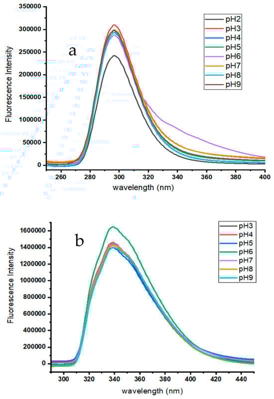 The pH has a significant impact on the formation of ATE and PRO inclusion complexes with β-CD. The pH was examined in the range from 2 to 9, and the results are presented in Figure 5a,b. The results indicate that the fluorescence intensity initially remained constant, then rose sharply at pH 3.0 for ATE and at pH 6.0 for PRO; after that, it dropped back to its original values. The optimum pH values for the inclusion complexes are therefore determined to be 3.0 and 6.0, respectively. The pKa value for ATE is reportedly 9.6 and for PRO 9.4 [31]. This confirms that the protonated form is the most suitable for the inclusion complexes.