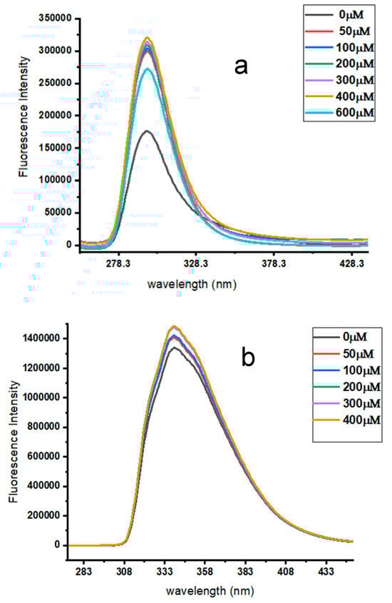 Emission spectra of (a) 10 μM ATE with different concentrations of β-CD, from 50 μM to 600 μM, for a time of 10 min, pH 3.0, at room temperature; and (b) 10 μM PRO with different concentrations of β-CD, from 50 to 400 μM, in a time of 10 min, pH 6.0, at room temperature.
