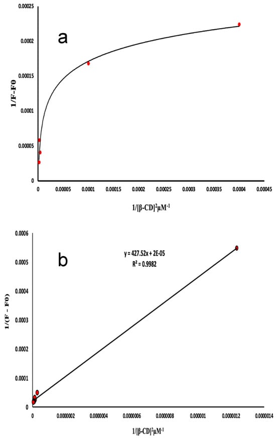Plot of (a) 1/(F − F0) vs. 1/[β-CD] of ATE-β-CD complex, 10 μM ATE, pH 3.0; and (b) plot of 1/(F − F0) vs. 1/[β-CD] of PRO-β-CD complex, 10 μM PRO, pH 6.0.