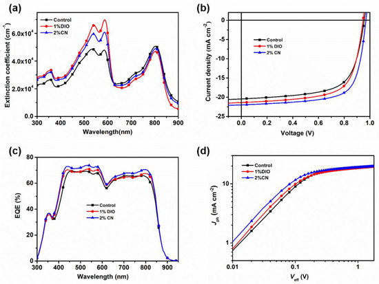 - Song, X.; Gasparini, N.; Baran, D. The Influence of Solvent Additive on Polymer Solar Cells Employing Fullerene and Non-Fullerene Acceptors. Adv. Electron. Mater. 2018, 4, 1700358. [Google Scholar] [CrossRef]