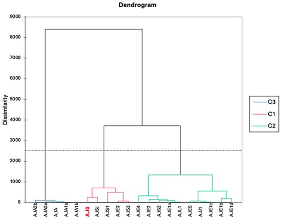 The AHC dendrogram (Figure 3) reveals three distinct clusters (C1–C3) among the samples (Table 2). Cluster C3 exclusively groups four essential oils (A.JA1a, A.JA2a, A.JA1b, and A.JA2b), all originating from Algeria. This cluster’s distinctiveness stems from the unique chemical profile of its central object, A. JA1a. In AHC, the central object represents the “average” chemical profile within a cluster. A. JA1a exhibits a significantly higher concentration of piperitone (71.1%) compared with Clusters 1 and 2 (samples from Jordan, Saudi Arabia, Egypt, and Libya). Additionally, some compounds, like (+)-camphor, are absent or present in much lower concentrations in Cluster 3 compared with the other clusters. While Clusters 1 and 2 show moderate to high concentrations of (+)-camphor (e.g., Cluster C2: 16.1%), Cluster 3 either lacks or has negligible amounts. This clustering pattern suggests a distinct chemotype or genetic variant of A. judaica specific to Algeria, showcasing a consistent and characteristic chemical profile within this subset of samples. The Köppen–Geiger climate classification system can offer insights into why piperitone levels were higher in Algerian samples [15].