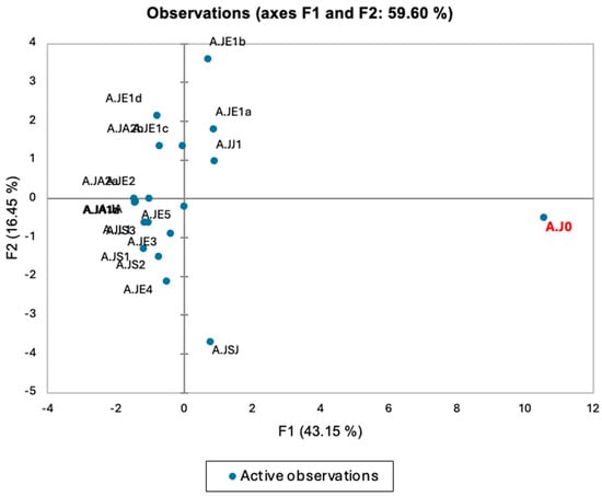 Ordination plot resulting from principal component analysis (PCA) applied to 20 oil samples. Axes F1 and F2 correspond to the first and second principal components, respectively. Axis F1 explains approximately 43.2% of the total variance, while axis F2 contributes an additional 16.5%.