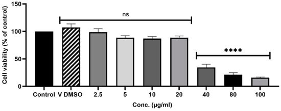 Effect of essential oil of A. judaica on macrophages (Raw 264.7) viability by the Alamar blue assay. Negative Ctrl (control); tested concentrations of the essential oil (2.5–100 µL/mL). Results are expressed as percentages of Alamar blue reduction by control cells. Each value represents the mean ± SD of three independent experiments performed in duplicate (**** p < 0.0001, compared with control). ns = not statistically significant.