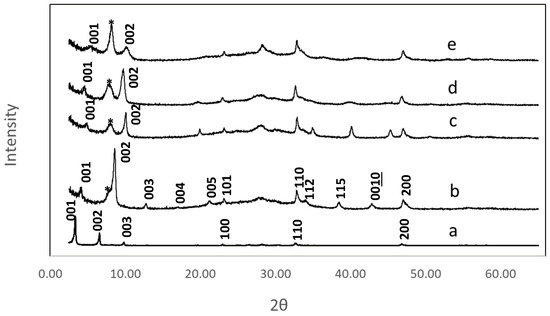 XRD patterns of n-decoxy-LaNb2O7 versus the samples after microwave reactions with hydroxyaromatic carboxylic acids, (a) n-decoxy-LaNb2O7, (b) HBCA-LaNb2O7, (c) HBA-LaNb2O7, (d) HPA-LaNb2O7, and (e) DBA-LaNb2O7. Select reflections are shown. The asterisk is attributed to residual HLaNb2O7 (see text).