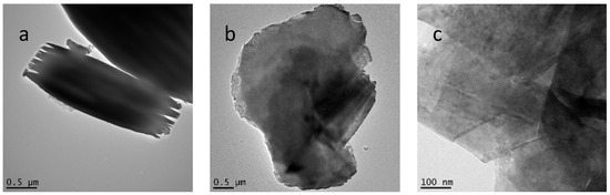 Transmission electron microscopy (TEM) studies were also consistent with a dramatic reduction in crystallinity (Figure 3 and Figure S4). The intermediate, n-decoxy-LaNb2O7, contained micron and submicron-sized crystals with some exhibiting mille-feuille-like layer disruption (Figure 3a) [28]. Images for the HBCA-LaNb2O7 appear in Figure 3b,c and those for HBA-LaNb2O7, HPA-LaNb2O7, and DBA-LaNb2O7 are shown in Figure S4. All samples show degraded crystallinity and significant disruption of the perovskite layer structure. In the HBCA-LaNb2O7, clear evidence of nanosheet formation is also seen (Figure 3c).
