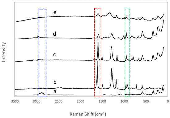 Raman spectra of the series of grafted compounds, (a) n-decoxy-LaNb2O7, (b) HBCA-LaNb2O7, (c) HBA-LaNb2O7, (d) HPA-LaNb2O7, and (e) DBA-LaNb2O7. The blue box (2800–3000 cm−1) highlights the alkyl region, the red box (~1600 cm−1), the aromatic region, and the green box (900–970 cm−1), the symmetric stretch of the apical Nb-O.