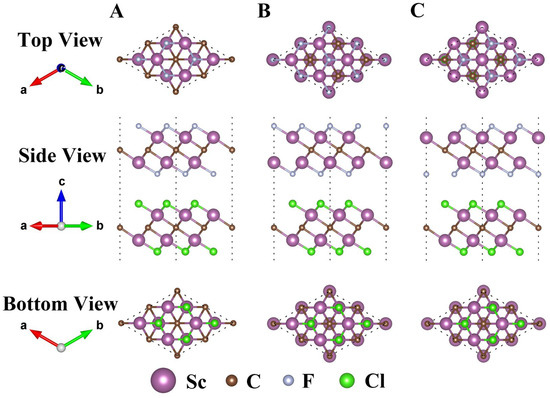 Top, side, and bottom views of the Sc2CF2/Sc2CCl2 heterostructure with three different stacking configurations of A, B, and C. The stacking configurations of Sc2CF2/Sc2CBr2 and Sc2CCl2/Sc2CBr2 heterostructures are similar to those of the Sc2CF2/Sc2CCl2 heterostructure.