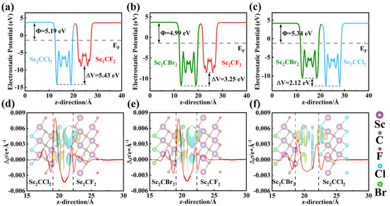 in which and represent the vacuum level and Fermi level, respectively. As shown in Figure S3a–c, Sc2CF2, Sc2CCl2, and Sc2CBr2 monolayers exhibit a fixed work function of 5.02 eV, 5.86 eV, and 5.48 eV, respectively, due to their highly symmetrical crystal structure [28]. Compared to Sc2CCl2 and Sc2CBr2 monolayers, the Sc2CF2 monolayer exhibits a smaller work function and a higher Fermi level. Thus, in the Sc2CF2/Sc2CCl2 and Sc2CF2/Sc2CBr2 heterostructures, free electrons can migrate from Sc2CF2 to Sc2CCl2 (or Sc2CBr2) until their Fermi levels reach equilibrium. As shown in Figure 4a,b, the work functions of the Sc2CF2/Sc2CCl2 and Sc2CF2/Sc2CBr2 heterostructures are 5.19 eV and 4.99 eV, respectively. At the same time, there are potential drops of 5.43 eV and 3.25 eV at the Sc2CF2/Sc2CCl2 and Sc2CF2/Sc2CBr2 heterostructures, indicating the presence of a built-in electric field at the interface of the heterostructures [52]. It also indicates that electrons are inclined to flow to Sc2CCl2 (or Sc2CBr2) monolayers. The built-in electric field will create a driving force to promote the combination of photogenerated electron–hole pairs between the electrons in the CBM of Sc2CCl2 (or Sc2CBr2) and the holes in the VBM of Sc2CF2. As displayed in Figure 4c, the difference in monolayer work function leads to the transfer of electrons from Sc2CBr2 to Sc2CCl2, causing a decline in the Fermi level in Sc2CCl2 and Sc2CBr2. The work function of the heterostructure in the final equilibrium state is 5.34 eV. Moreover, a potential drop of 2.12 eV is found across the interface. This is proof of a built-in electric field at the interface of the Sc2CCl2/Sc2CBr2 heterostructure.