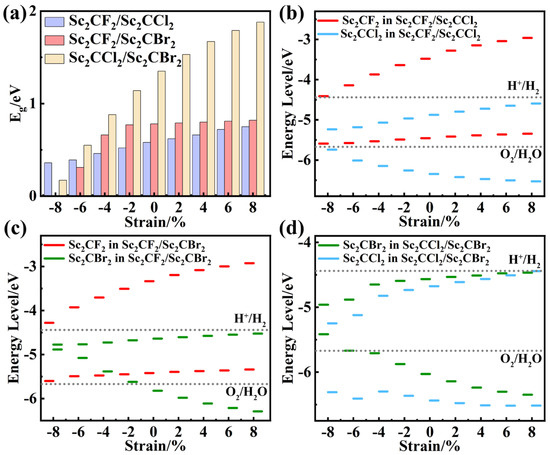 The (a) band gaps and (b–d) band alignment of strained Sc2CF2/Sc2CCl2, Sc2CF2/Sc2CBr2, and Sc2CCl2/Sc2CBr2 heterostructures.
