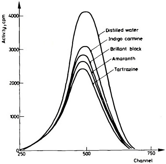 Over the next decade, work focused on Cherenkov emission spectra was carried out. Such work was concerned with peak amplitudes for detecting and characterizing radioisotopes in solutions. A clear example is the measurements reported in Francois’s 1973 work on the topic [26]. It was a full decade before Cherenkov Photometry would pick back up again, prompted by a series of studies from Kulcsár and coworkers, beginning in 1978. Kulcsár’s 1978 study [27] was on the concentration dependency of various water-soluble dyes on Cherenkov spectra. In the first study, solutions of Indigo carmine, Brilliant Black, Amaranth, and Tartrazine were placed in front of various standard emission sources containing aqueous solutions of K 40 , C s 137 , or P 32 . The Cherenkov spectrum was recorded (Figure 1).