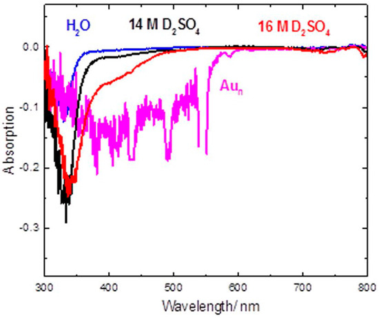 Lastly, we note the recent work by Ghandi et al. in 2019 [45]. This work demonstrated (Figure 3) that extremely dilute (particle concentration = 3.3 × 10−8 M) aqueous solutions of gold nanoparticles exhibit strong Cherenkov emissions. The study suggested that this potentially could lay the way for Cherenkov spectroscopic techniques to be applied within the nuclear industry. Deposition of bulk metals—presumably beginning as metal nanoparticles in coolant streams—may be detected. These spectra were interpreted as negative absorbance spectra using a pulse radiolysis setup once the contributions of the laser light had been subtracted. Given the orders of magnitudes of difference in luminosity of the two light sources, the subtracted data were necessarily somewhat noisy. This was compounded by the strongly scattering nature of solutions of gold nanoparticles. As such, Cherenkov measurements of this system taken in this way necessarily exhibited large errors. While the observation was predictably noisy, the presence of a large signal was unarguable, and the presence of some features was potentially observed. As such, follow-up studies were needed to pin down the exact degree to which this “enhancement” would have spectroscopic potential.