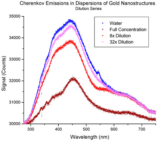 Figure 4. Cherenkov emission spectra for various dilutions of ~40 nm gold nanoparticles. Note the absence of any enhancement relative to water (blue) [46]. The full concentration was 100 pM. The figure was used with permission from the journal.