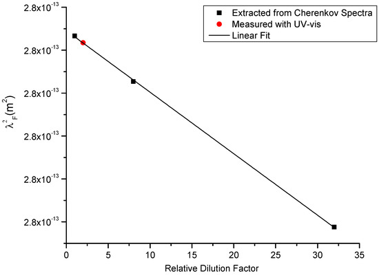 Figure 5. The linear trend in the square of extracted LSPR wavelengths. Black was extracted via Cherenkov Spectroscopy; red was measured with UV-vis spectroscopy (data from [46]).