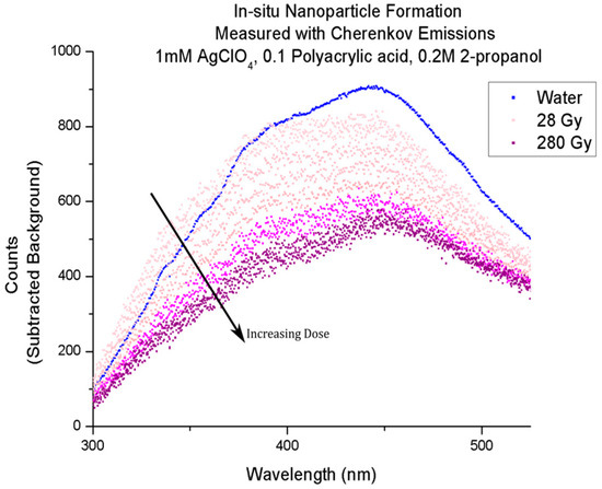 The aforementioned study was expanded upon with a series of experiments. Concentration series on various sizes of aqueous solutions of gold nanoparticles were probed with an electron beam and their Cherenkov response was recorded [46]. The study substantiated the observations of Cherenkov “enhancement” in certain systems of gold nanoparticles (Figure 4).