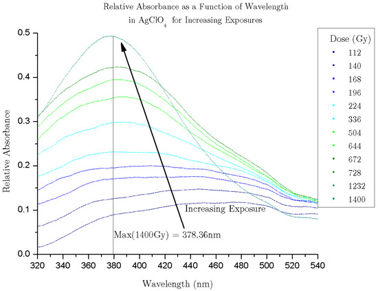 A subsequent study was carried out in a solution of silver salt, measuring the change in the Cherenkov spectrum recorded (Figure 6 and Figure 7 (same data as Figure 6, smoothed and interpreted as absorbance relative to water because of a point source of light behind the sample. This analysis may not be robust enough to draw substantiated conclusions. Sufficient analysis requires consideration of no light at the far boundary and light being produced along the path of the electron, but it qualitatively shows the progression of the curves towards a “plasmon-like” absorption spectrum is qualitatively apparent)) of the solution exposed to iterative pulses of the electron beam [47]. The spectrum noticeably changed in a way consistent with the formation of silver nanoparticles via radiolytic reduction. The study demonstrated for the first time that the technique is not only sensitive to static material properties of solutions but can also be used to detect chemical changes in situ.