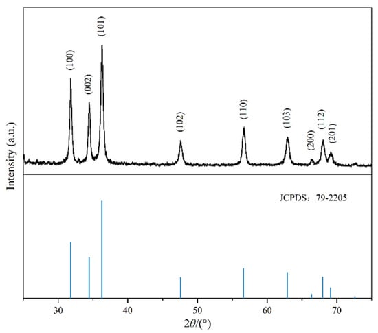 The X-ray diffraction spectrum of the ZNRN sample is shown in Figure 2, revealing distinct diffraction peaks at various 2θ degrees: 31.765°; 34.418°; 36.250°; 47.534°; 56.589°; 62.850°; 66.369°; 67.940°; and 69.078°. These peaks were associated with the (100), (002), (101), (102), (110), (103), (200), (112), and (201) planes, respectively. The observed diffraction pattern was consistent with the characteristic X-ray diffraction peaks and lattice spacings of ZnO crystals with a hexagonal wurtzite structure (JCPDS: 79-2205) [24]. This alignment strongly suggests the successful loading of ZnO onto the surface of the nonwoven fabric. The growth process of nano ZnO was divided into two parts: the nucleation process and the secondary growth process. The first step involved the formation of ZnO seed nuclei, and the second step was the continuous growth toward specific crystal faces based on the crystal nucleus. Moreover, the synthesis duration determined the completeness of the ZnO crystal growth [25,26]. In addition, the EDS of ZNRN is shown in Figure S1a–f, which confirmed that ZNRN also contained Zn and O elements in addition to the C elements existing in the original nonwoven fabric. Figure S1b shows the corresponding EDS spectra of Zn elements. The XPS diagram of the modified nonwoven fabric is shown in Figure S2. Figure S2a shows the total XPS spectrum of ZNRN (A) and the original unmodified nonwoven fabric (C). It could be seen from the diagram that the modified nonwoven fabric obviously had more obvious Zn peaks than the original unmodified nonwoven fabric. Figure S2b is a partial peak fitting diagram of Zn2p. It was shown that the spectra at 1022.2 eV and 1045.2 eV corresponded to Zn2p3/2 and Zn2p1/2 of Zn in ZnO. Therefore, nano-zinc oxide was successfully loaded onto the nonwoven fabric.