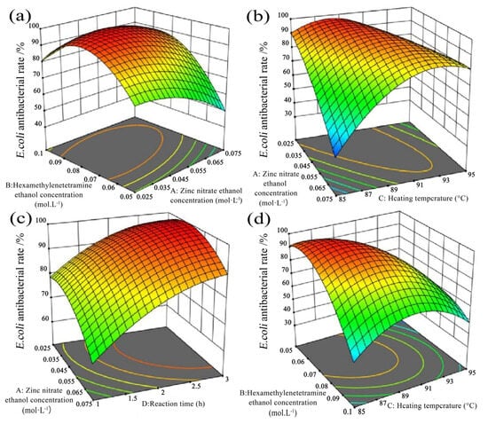 While under the condition of a zinc nitrate concentration of 0.025 mol/L and a synthesis duration of 1.72 h, with a constant concentration of HMTA, the antibacterial rate against E. coli slowly increased with rising heating temperatures and then rapidly decreased (Figure 5d). Conversely, with a constant heating temperature, the antibacterial rate against E. coli quickly decreased with the increase in the HMTA concentration.