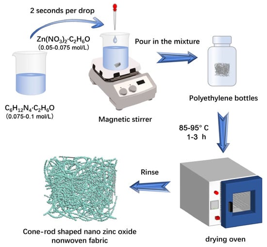 Polypropylene nonwoven fabric (Jialianda Nonwoven Fabric Co., Ltd., Dongguan, China) was cut into pieces with the size of 2 cm × 2 cm. These fabrics were sequentially washed in a mixture of petroleum ether, anhydrous ethanol, and deionized water for 1 h in an ultrasonic cleaner. The cleaned fabrics were dried in an oven at 60 °C for 24 h and then stored and prepared for later use. Different amounts of hexamethylenetetramine and zinc nitrate chemicals were added separately into a beaker containing 50 mL of anhydrous ethanol. They were stirred with a glass rod until dissolved, thereby preparing hexamethylenetetramine ethanol solution (0.075–0.1 mol/L, C6H12N4, Shanghai Ep Biotech Co., Ltd., Shanghai, China) and zinc nitrate ethanol solution (0.05–0.075 mol/L, Zn(NO3)2, Tianjin Guangfu Technology Development Co., Ltd., Tianjin, China). The hexamethylenetetramine ethanol solution was then added dropwise into the zinc nitrate ethanol solution at a rate of 2 drops per second, followed by stirring with a magnetic stirrer for 5 min [48]. When a white suspension was formed in the beaker, the suspension was transferred into a polyethylene bottle containing the prepared fabrics. Such a bottle was sealed and heated in an air-drying oven at 85–95 °C and heated for 1–3 h (The specific values for the four factors, namely hexamethylenetetramine ethanol solution, zinc nitrate ethanol solution, temperature, and reaction time, were referenced from Table S1). After this hydrothermal procedure, the fabrics were washed repeatedly until the ZnO residue was removed by deionized water. These cleaning fabrics were further dried at 60 °C, and ZnO nanorod nonwoven fabrics (ZNRN) were fabricated [49]. The process is illustrated in Figure 9.