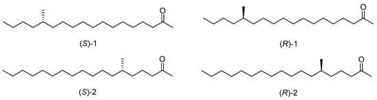 The Lichen moth, Lyclene dharma dharma (Arctiidae, Lithosiinae), is a species within the Lithosiinae subfamily of the Arctiidae family. It is notable as the first species in this subfamily for which the sex pheromone has been identified [1]. This moth is distributed globally, and its larvae predominantly feed on forest lichen, playing a crucial role in supporting the forest ecosystem [2]. In 2007, Ando and his coworkers identified three electroantennographically active components in female moths of Lyclene dharma dharma (Arctiidae, Lithosiinae), namely 14-methyl-2-octadecanone, 6-methyl-2-octadecanone, and 6,14-dimethyl-2-octadecanone; they synthesized these racemic sex pheromone components and found them in a ratio of approximately 1:2:1 [1,2,3]. Subsequently, they confirmed that (S)-14-methyloctadecan-2-one ((S)-1) and (S)-6-methyloctadecan-2-one ((S)-2) are active pheromone components (Figure 1) and 6,14-dimethyl-2-octadecanone was not indispensable for bioactivity [4].