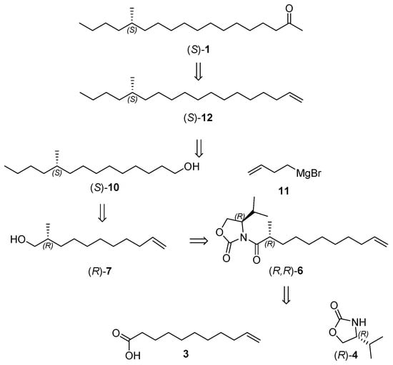 The synthesis of the active sex pheromone components (S)-1, (S)-2, and their enantiomers ((R)-1, (R)-2) was previously based on a chiral pool strategy. In 2009, Mori completed the synthesis of sex pheromone components in Lyclene dharma dharma, the synthesis of (S)-1 with a total yield of 6% in 13 steps, (S)-2 with a total yield of 20% in 11 steps, using enantiomers of citronellal and methyl (S)-3-hydroxy-2-methylpropanoate as chiral starting materials, with olefin cross metathesis as the key reaction [5]. They then employed the Wittig reaction, alkylation of alkynes, and acetoacetic ester synthesis to construct sex pheromone components in Lyclene dharma dharma from (S)- and (R)-citronellal; they synthesized (S)-1 with a total yield of 11% in 15 steps, (S)-2 with a total yield of 10% in 13 steps [6]. In 2023, Kobayashi and colleagues reported the synthesis of (S)-14-methyloctadecan-2-one with a total yield of 10% in seven steps, using (S)-3-butyn-2-ol as a chiral starting material, with a copper-catalyzed coupling reaction of alkynyl 2-pyridyl sulfonate and an alkyl lithium reagent as the key reaction [7]. The reported synthetic routes still have some shortcomings, such as difficult synthetic routes, expensive chiral starting materials, complex synthetic operations, and poor overall yields. To facilitate future applications of the active sex pheromone components in exploring the communication mechanisms of Lichen moths, species-specific studies and ecological management, and developing a concise and efficient synthetic method, are still in demand [8]. Herein, we synthesized the active sex pheromone components of Lyclene dharma dharma (Arctiidae, Lithosiinae) and their enantiomers by an enantioselective synthesis strategy. Our methodology employed Evans’ chiral auxiliaries, a Grignard cross-coupling reaction, hydroboration–oxidation and Wacker oxidation as key reactions, enabled straightforward synthesis, and yielded the target pheromone with high enantiomeric purity.
