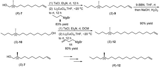 The construction of the chiral long chain terminal alkene 12 is shown in Scheme 3. (S)-2-Methylundec-10-en-1-ol ((S)-7) was activated with tosyl chloride (TsCl) to yield a p-toluenesulfonyl intermediate, which coupled with propylmagnesium bromide and catalytic lithium tetrachlorocuprate (II) (Li2CuCl4) to afford (S)-10-methyltetradec-1-ene ((S)-9) in 83% yield [17]. The hydroboration–oxidation of (S)-9 by 9-borabicyclo [3.3.1] nonane (9-BBN) and hydrogen peroxide (H2O2) yielded (S)-10-methyltetradecan-1-ol ((S)-10) with a 90% yield [18]. Subsequent tosylation of compound (S)-10 with TsCl, followed by coupling reaction with but-3-en-1-ylmagnesium bromide, smoothly produced (S)-14-methyloctadec-1-ene ((S)-12) in 80% yield [19,20]. According to similar steps, (R)-14-methyloctadec-1-ene ((R)-12) was constructed from (R)-2-methylundec-10-en-1-ol ((R)-7).