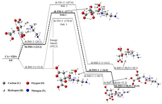 Since the Gibbs free energy of the product (di-CA-IM3 + H2O) is 48.0 kJ∙mol−1 higher than that of the reactants (Figure S1), the dimerization of two CA molecules through the hydroxyl group is very challenging, which is in agreement with the above ESP result. Figure 2 displays the dimerization process of EDA with three different carboxyl groups of CA. The first path (path 1) is the reaction of EDA and the carboxyl group containing the C9 atom. The second path (path 2) is the reaction between EDA and the carboxyl group containing the C18 atom. The third path (path 3) is the reaction of EDA and the carboxyl group containing the C3 atom. As can be seen, the energy barrier of path 1 is relatively the lowest (177.7 kJ∙mol−1), followed by path 2 (187.6 kJ∙mol−1), indicating that the carboxyl group containing the C9 atom in CA is the main reaction site; this is also consistent with the above ESP result. In other words, the amino group (H23–N22–H24) of EDA will preferentially approach the carboxyl group containing the C9 atom in CA rather than the carboxyl group containing C18 and C3. Then, the N22 atom of EDA connects with the C9 atom in CA to gain a new bond, C9–N22 (1.53 Å), but the bond length of C9–O13 increases from 1.35 Å to 2.18 Å. Meanwhile, the H24 atom shifts from N22 to O13 via transition state di-TS1-1, leading to the formation of the intermediate di-IM2-1. Finally, the water molecule (H14–O13–H24) leaves the intermediate di-IM2-1 to produce the final dimerization product di-IM3-1, with free energy decreased by 27.0 kJ∙mol−1, which is energetically favorable.