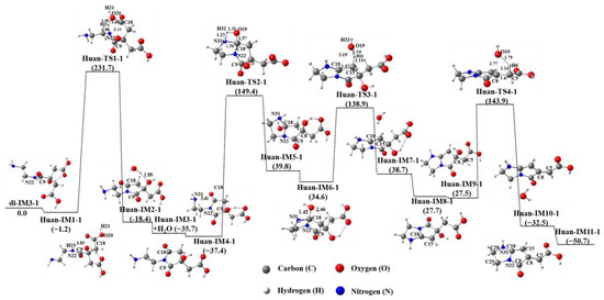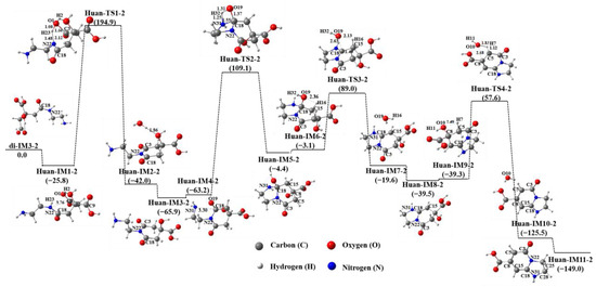 Figure 3 presents the cyclization process of di-IM3-1 in an aqueous solution. It can be seen that the N22 atom in di-IM3-1 first approaches the C18 atom, while the H23 atom leaves N22 and transfers to the O20 atom of the carboxyl group via the transition state Huan-TS1-1 to attain the intermediate Huan-IM2-1. Then, the water molecule (H23–O20–H21) leaves the intermediate to obtain the product Huan-IM3-1, containing a five-membered ring, with a potential energy reduction of 35.7 kJ∙mol−1. Next, another N31 atom closes to the C18 atom, while its connected H32 atom migrates to the O19 atom to gain a hydroxyl group (O19–H32) through the transition state Huan-TS2-1 to produce the product Huan-IM5-1 with two five-membered rings.