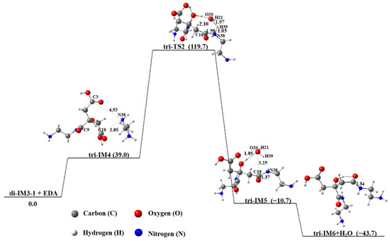 When the molar ratio of EDA to CA is 3.0, three EDA molecules will react with one CA molecule. That is, on the basis of the reaction between two EDA molecules and CA, the third EDA molecule will continue to participate in the subsequent reaction, as described in Figure 9. The energy barrier of this process is 193.1 kJ∙mol−1. The final product CA-3EDA-IM3 + H2O has the lowest free energy and is 42.3 kJ∙mol−1 lower than the reactants, making it energetically favorable. Since the free energy of the isomers obtained from intermolecular interactions was always higher than that of CA-3EDA-IM3 + H2O (Table S5), the main product obtained from tri-IM6 and EDA was CA-3EDA-IM3 + H2O.