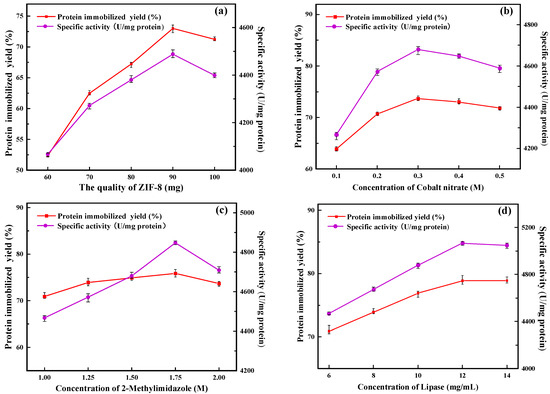 As shown in Figure 1b, the protein immobilization yield and the specific activity of PFL@ZIF-8@ZIF-67 first increased and then decreased as the concentration of cobalt nitrate kept increasing. When the concentration of cobalt nitrate was less than 0.3 M, it was favorable for ZIF-8@ZIF-67 to form a more complete crystal structure with an increasing concentration of cobalt nitrate, and the lipase was continuously encapsulated inside the carrier. As the cobalt nitrate concentration was further increased, the protein immobilization yield and specific activity of PFL@ZIF-8@ZIF-67 both showed decreases. This is because excess metal ions can have an inhibitory effect on lipase [26], and as the concentration of cobalt nitrate increases, Co2+ in solution inhibits the activity of lipase through a non-competitive effect. The cobalt nitrate concentration was finally chosen as 0.3 M for the following experiments.