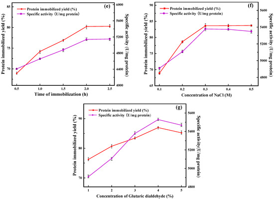 In this study, the immobilization of PFL occurred in two steps. The first step was the encapsulation of the lipase on the support, and the second step was the covalent reactions between the glutaraldehyde groups and the enzyme Schiff-base formation between the primary amino groups of enzymes (terminal amino groups or ε-amino group of lysine residues) [34]. Figure 1g shows the curves of the protein immobilization yield and the specific activity with the concentration of glutaraldehyde. It can be seen from the figure that the protein immobilization yield and the specific activity of PFL@ZIF-8@ZIF-67 were the highest when the glutaraldehyde concentration was 4%. Glutaraldehyde, as a crosslinking agent, has good polymerization of protein molecules, and the appropriate amount of glutaraldehyde will improve the protein immobilization yield and activity of PFL@ZIF-8@ZIF-67. When the concentration of glutaraldehyde in the system was low, the number of aldehyde groups in the reaction system was small, and intermolecular crosslinking could easily occur, thus maintaining the spatial configuration of protein molecules and improving the immobilization yield and activity of lipase [35]. When the concentration of glutaraldehyde exceeded 4%, the protein immobilization yield and activity decreased because glutaraldehyde was both a crosslinking agent for immobilization reactions and a denaturant that can inactivate the enzyme. At this time, the reaction system was prone to intramolecular crosslinking and multi-point binding of the aldehyde group to the amino group on the enzyme protein molecule, leading to changes in the advanced structure of the enzyme protein and destroying part of the active site of the enzyme, thus reducing activity [36]. Moreover, distortion of the secondary structure of lipase directly by high glutaraldehyde concentration in crosslinking treatment resulted in greater inactivation of lipase [34]. In the end, a 4% glutaraldehyde concentration was chosen.