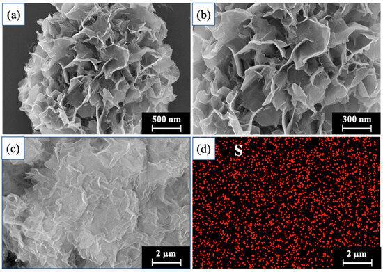 SEM analysis of PFL@ZIF-8@ZIF-67: (a–c) SEM images; (d) the mapping of S elements on a local scale.