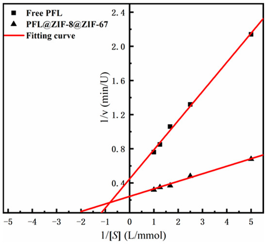 The kinetic constants of the enzymes, including Km and Vmax of PFL@ZIF-8@ZIF-67 and the free PFL, were obtained by linear regression of different substrate concentrations and initial reaction velocity catalyzed by the enzymes (Figure 5). The Vmax value of PFL@ZIF-8@ZIF-67 was 4.13 Mm/min, which was greater than the free PFL (2.24 mM/min). The significant increase in Vmax could indicate that the lipase immobilized on ZIF-8@ZIF-67 has a higher catalytic efficiency than the free enzyme, which is related to the activation of the lipase [40]. The Km value of the immobilized lipase (0.36 mM) was lower than that of the free lipase (0.76 mM), indicating that the affinity of the enzyme to the substrate was improved after immobilization. Some studies indicated that the decrease in Km was related to the hydrophobic support and the open conformation of lipase [41,42].
