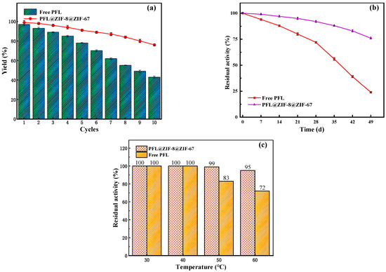 Thermal stability is very important for an immobilization method. The free lipase and PFL@ZIF-8@ZIF-67 were incubated at different temperatures for 6 h and lipase activity was measured, as shown in Figure 7c. When the temperature was less than 40 °C, the transesterification activities of the free enzyme and the immobilized enzyme did not decrease. When the temperature was higher than 40 °C, the transesterification activity of PFL@ZIF-8@ZIF-67 decreased, but the degree of decrease was lower than that of the free PFL. At 60 °C, the residual activities of PFL@ZIF-8@ZIF-67 and the free PFL retained 95% and 72%, respectively. The interactions between lipase and MOF@MOF during the immobilization process can be explained by the enzyme’s protection of its tertiary structure [54].