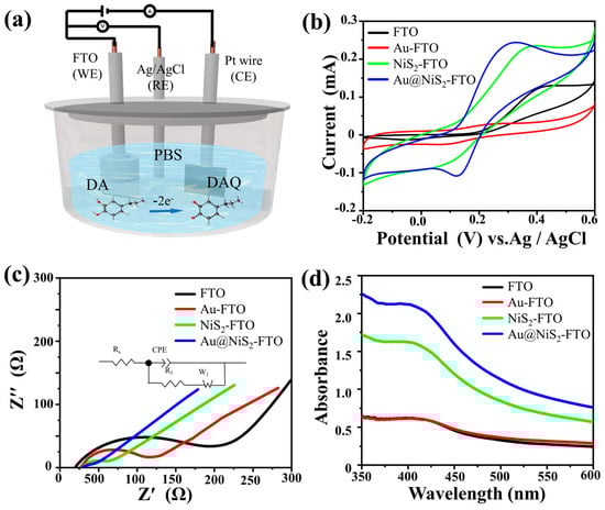 (a) Schematic of the electrochemical testing setup; (b) CVs of bare FTO, Au-FTO, NiS2-FTO, and Au@NiS2-FTO in 1 mM DA in 0.01 M PBS (pH = 7.3) at a scan rate of 0.1 V s−1; (c) Nyquist plots of bare FTO, Au-FTO, FTO-NiS2, and FTO-Au@NiS2 in 0.1 M KCl containing 0.5 mM Fe(CN and Fe(CN; (d) the UV–Vis absorption spectra of 1 mM DA in 0.1 M PBS (pH = 7.3) before and after applying a voltage of 0.3 V.