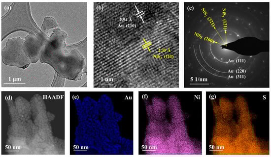 (a) TEM images of Au@NiS2; (b) HRTEM images of Au@NiS2; (c) SAED pattern of Au@NiS2; (d) scanning HAADF-STEM image of Au@NiS2 and corresponding elemental mapping of (e) Au, (f) Ni, and (g) S.