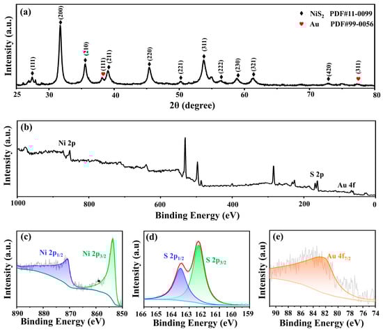 (a) XRD patterns of Au@NiS2. (b) XPS survey spectra of Au@NiS2 and the high-resolution spectra of Au@NiS2 in the energy range of (c) Ni 2p, (d) S 2p, and (e) Au 4f.
