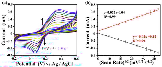 (a) CV curves of the Au@NiS2-FTO-modified electrode in 0.1 M PBS (pH = 7.3) containing 1 mM DA by varying the scan rates from 5 mV s−1 to 1 V s−1; (b) Ipa and Ipc vs. v1/2.
