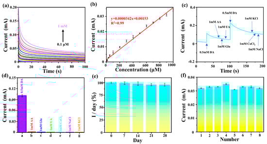 Moreover, differential pulse voltammetry (DPV) is an electrochemical analysis technique commonly used to measure electrochemically active substances in solution. The testing method involves applying a series of pulse voltages on an electrochemical electrode and measuring the current response caused by these pulse voltages. DPV is a widely used electrochemical measurement method in sensor analysis, known for its high sensitivity and selectivity []. DPV was used to test its sensitivity by adding different concentrations of DA within the same voltage range. Similarly, in a three-electrode system with 0.1 M PBS (pH = 7.3) as the electrolyte, DPV was performed with a voltage window from −0.2 V to 0.6 V, a step potential of 4 mV, an amplitude of 50 mV, and a pulse period of 0.2 s. The obtained data are shown in Figure 5d, and the linear regression equation is as follows: