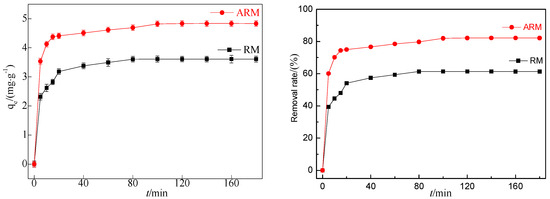 According to Figure 1, under the same conditions, the adsorption capacity of CIP by RM after sulfuric acid acidification increased from 3.62 to 4.84 mg/g, and the removal rate increased from 61.41% to 82.21%. This indicates that ARM has a significantly better adsorption performance for CIP than RM.
