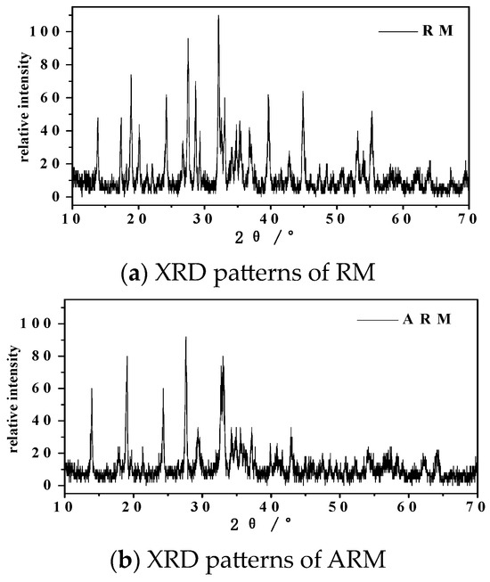 The results of the TG analysis are compared with literature data [31] in Table S3. The results show that the changes in RM and ARM were caused by the internal structure of crystal water, which has a lower water content. When the ARM was heated, no obvious chemical or physical reaction occurred, and the thermal stability was strong. The TG trends of RM and ARM are consistent with Zhu’s research results [32].