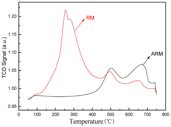 The experimental results of NH3-TPD are shown in Figure 5. As we all know, the adsorption capacity of the adsorbent is related to the number of active sites, the oxidation state of the active phase, the mobility of oxygen in the adsorbent matrix, and other factors [33]. Peaks in the low-temperature range of 100~300 °C indicate that the physical adsorption of molecular oxygen and chemisorbed oxygen are desorbed above or near the surface of the adsorbent, peaks in the 300~500 °C range are attributed to the surface lattice oxygen in the adsorbent, and peaks in the high-temperature range of 500~800 °C are attributed to the bulk lattice oxygen of the adsorbent. The peak intensity of RM at about 245 °C is extremely high, which is mainly the signal value generated by the decomposition of the CaCO3 in red mud into CO2 at this temperature. In addition, RM has two small peaks at 495 °C and 650 °C, corresponding to the desorption of surface oxygen vacancies and bulk oxygen vacancies. The peak of ARM appears at 500 °C and 668 °C, respectively. Compared with RM, which shifted toward a high temperature, the peak strength increased, indicating that the interaction between sulfuric acid and Fe changed the electronic structure of the oxygen vacancy of the adsorbent. This resulted in surface defects, providing a suitable adsorption site for oxygen molecules and strengthening the adsorption capacity of oxygen species on the adsorbent.
