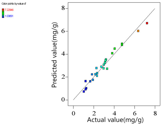 Figure 6 shows the adsorption capacities calculated from the established quadratic polynomials and the measured ones. It was obvious that both the predicted and the measured values conformed to a normal distribution, with the coefficient of determination R2 = 0.9629, indicating that 96.3% of all variation can be explained. Furthermore, the adjusted coefficient of determination (R2Adj) for the model stood at 0.9389, indicating a strong fit. The signal-to-noise ratio (SNR) was 25.92, much higher than 4, so the model is highly reliable, and the data are reasonable. Therefore, Equation (1) accurately and reasonably reflects the relationship between the adsorption capacity and the variables.