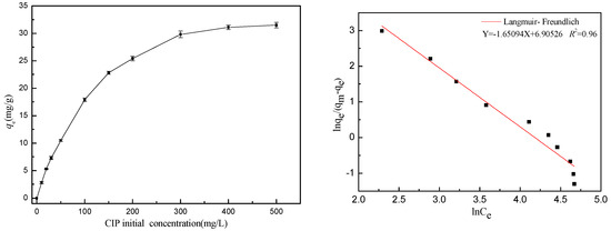 Fitting curves of the Langmuir–Freundlich isotherm model (pH0 = 3.04, T = 45 °C, [CIP] = 10~500 mg/L, [ARM] = 3.4 g/L, r = 250 rpm).